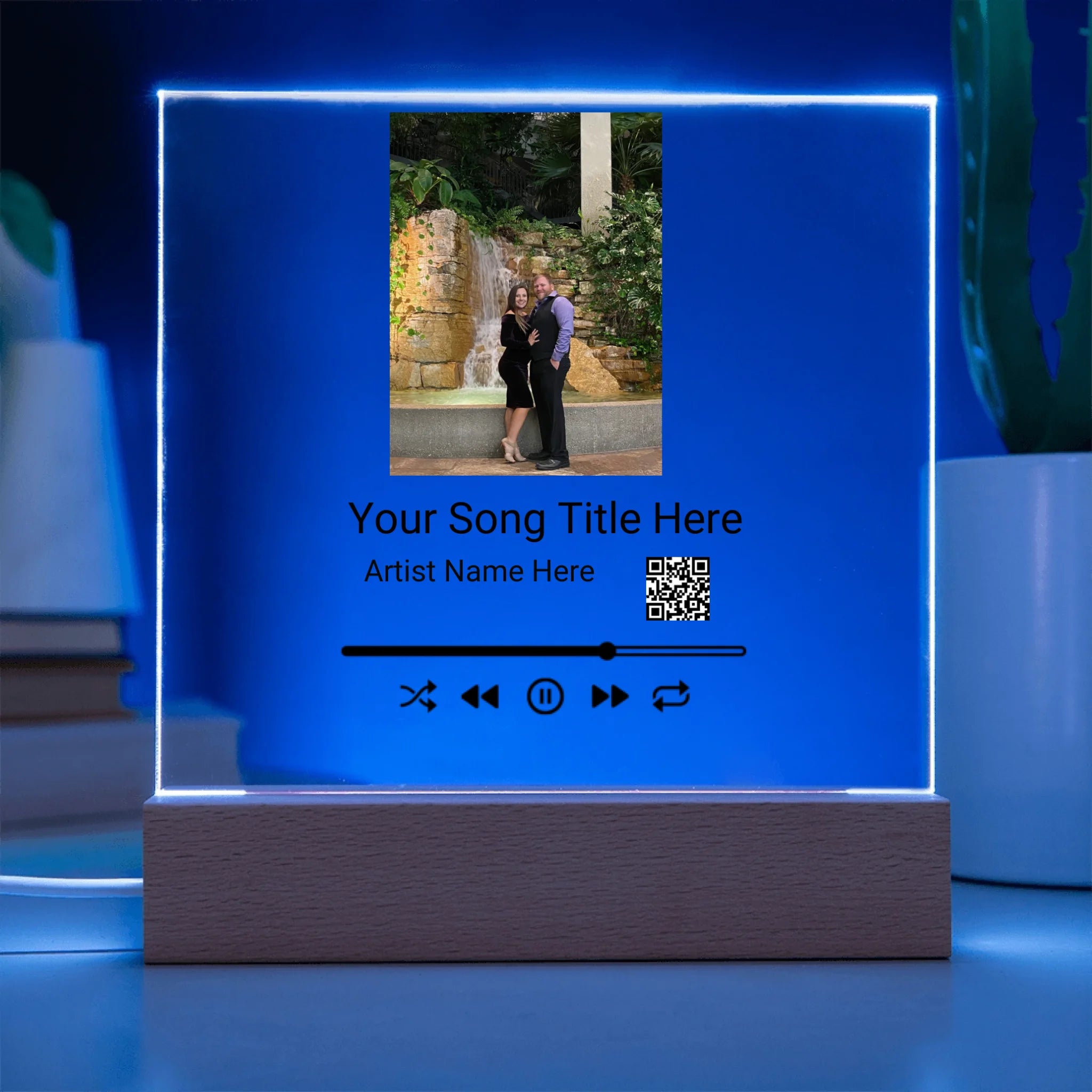 Your plaque will be crafted from premium acrylic with a professionally printed design for a polished look. It comes with a stylish wooden LED base, and you can choose between a USB plug-in option OR a cordless battery-operated option (requires 2 AAA batteries, not included). Both LED bases feature 7 vibrant colors, allowing the user to customize the lighting with various color changes and dynamic cycles.
